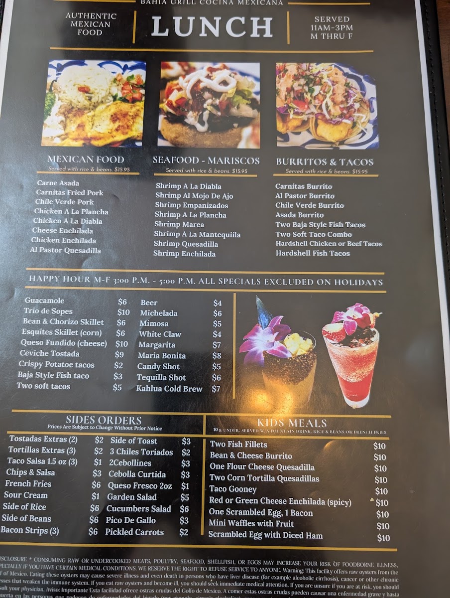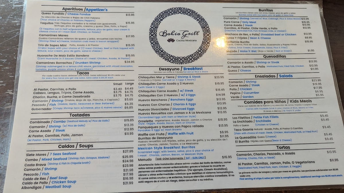 At Bahia Grill Cocina Mexicana Menu, you’ll experience an authentic taste of Mexico, right in the heart of Corona. The menu is packed with mouthwatering choices, from sizzling fajitas to perfectly seasoned tacos. Whether you’re in the mood for tender carne asada, slow-cooked carnitas, or a classic burrito filled with all your favorite toppings, there’s something for everyone. Each dish is crafted with fresh, quality ingredients that bring out the vibrant flavors of Mexican cuisine. The variety of sides, like creamy guacamole and zesty salsa, perfectly complement every meal, offering a taste of tradition in every bite. It’s the ideal spot to enjoy a lively atmosphere while savoring your favorite Mexican dishes.