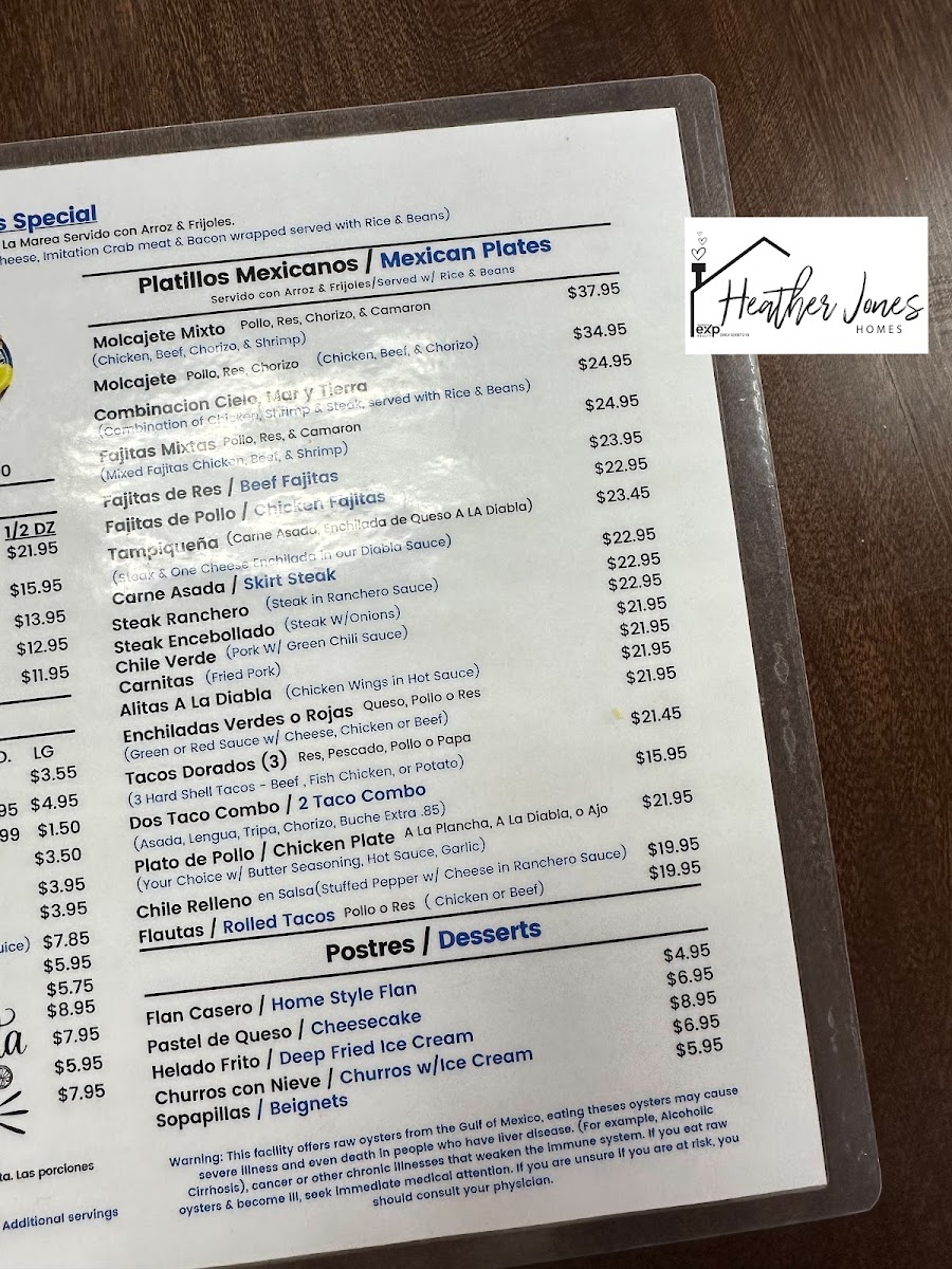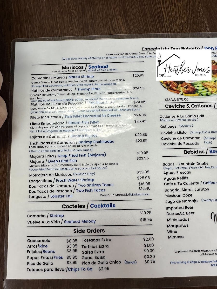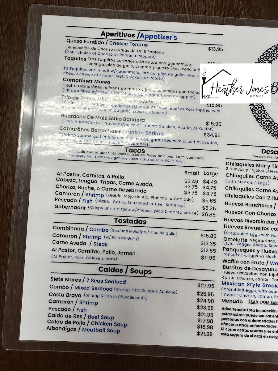 Pollo, res, chorizo, & camaron. Chicken, beef, chorizo, & shrimp.